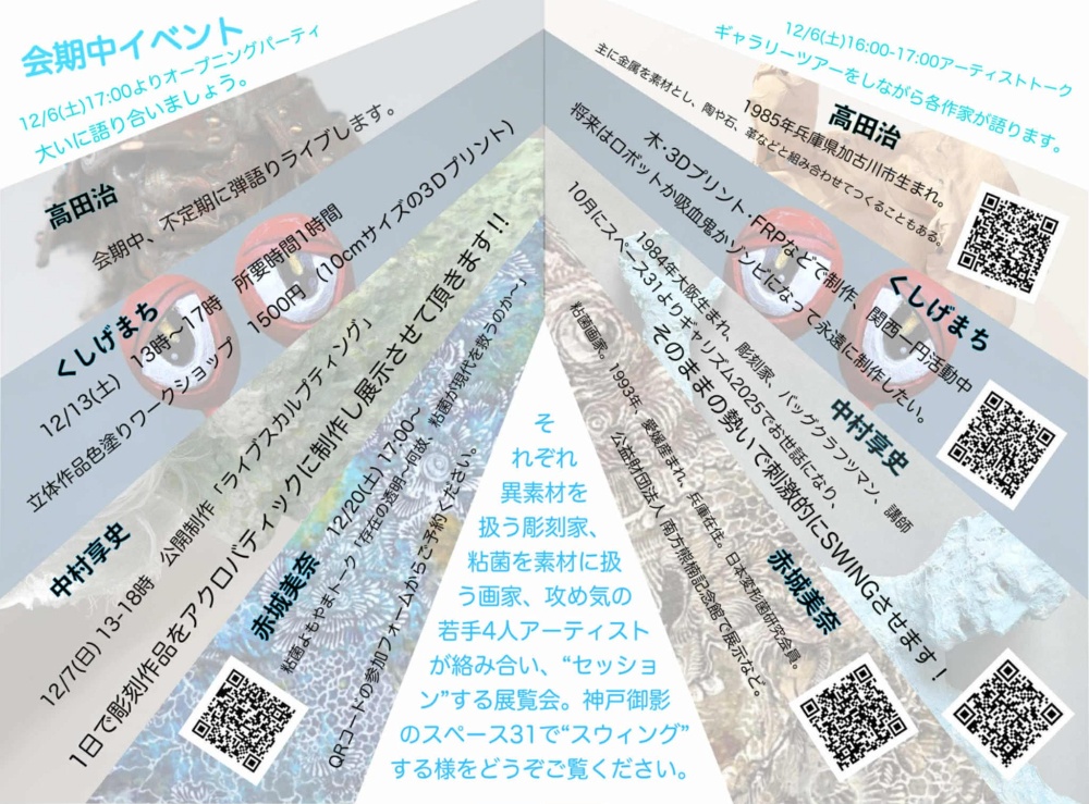 それぞれ異素材を扱う彫刻家、粘菌を素材に扱う画家、攻め気の若手4人のアーティストが絡み合い“セッション”する展覧会です。Space31でスウィングする様をどうぞご覧ください。