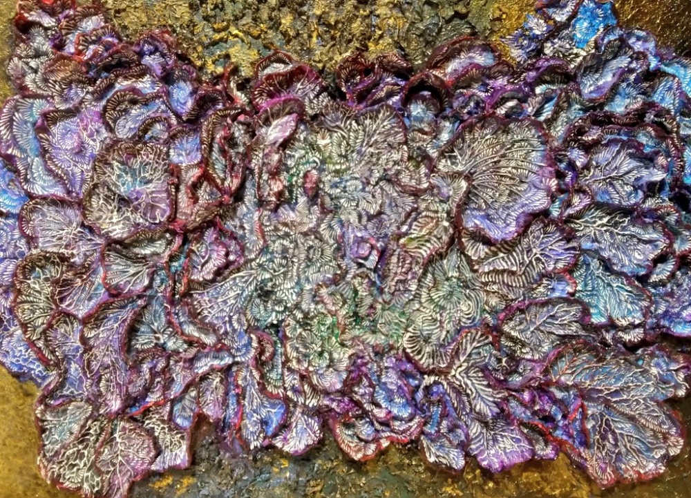 《溶媒する全躯における小宇宙》2025年 A1号 (W84.1cm×H59.4cm)販売価格¥480,000-(税込)画材[石塑粘土、陶土樹脂に変形菌の胞子を練りこんだ半立体造形画に天然白墨(チタン添加)]