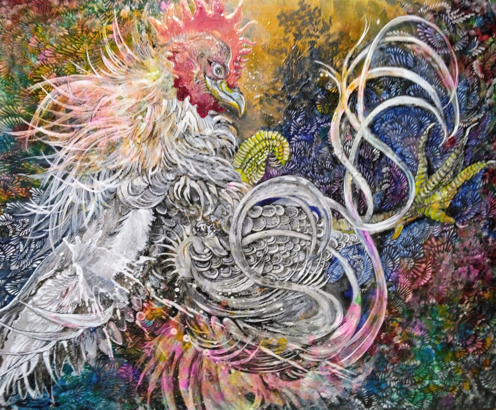 画材[自作白墨(鳥骨、膠、粘菌オオムラサキホコリ(兵庫)、トビゲウツボホコリ(和歌山)、ウニ殻、カラッパ、ヒミズ骨、珈琲(グアテマラ産)、UV保護ニス、防腐剤(柿渋・亜麻仁油)、岩絵の具、顔料、ミネラルスピリッツ)に天然日本岩絵の具等で着彩]