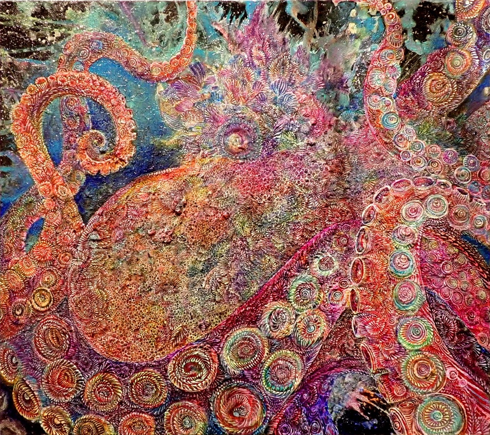 作品に施した「砕け散るような紋様」は、章魚が死に際に既に細胞破壊(アポトーシス)が始まっている状態。